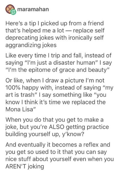 I use humor (often self destructive) as my immediate defensive mechanism, rather than acknowledging that i'm struggling. I am trying not to do this more, be proud of myself, my work, and be aware of my accomplishments.