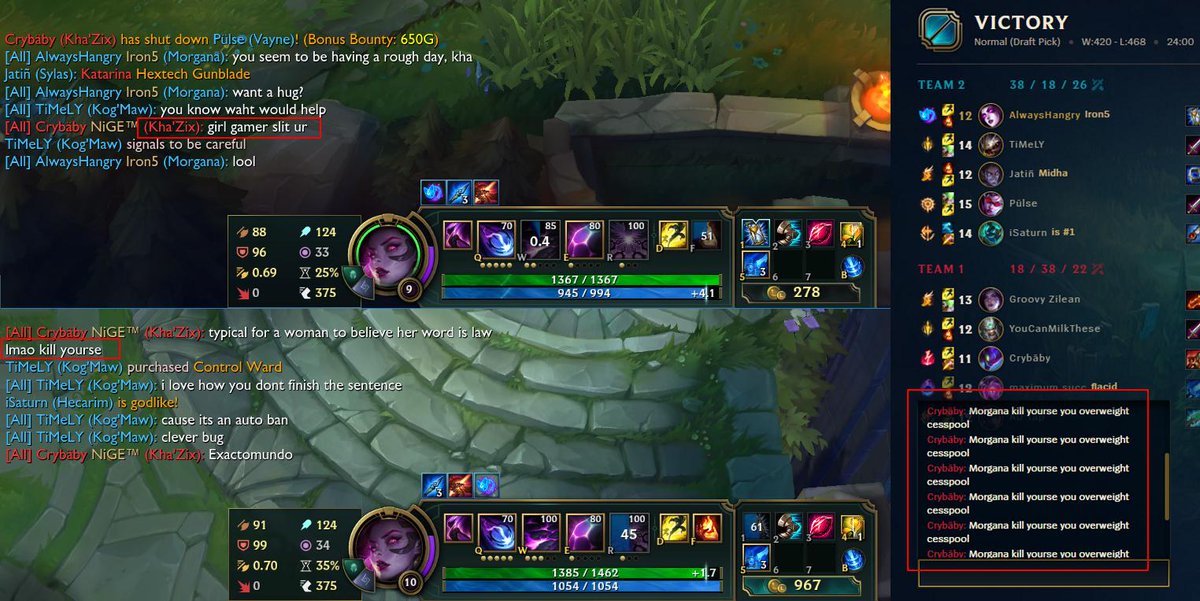 This is what happens occasionally when you let it be known that you're a woman while gaming online. #LeagueOfLegends (Context: They were losing, the Kha'Zix player was insulting everybody, somebody called me 'bro', I'd said I wasn't a 'bro', and we all know what happens next...)pic.twitter.com/cmAsaGoecK