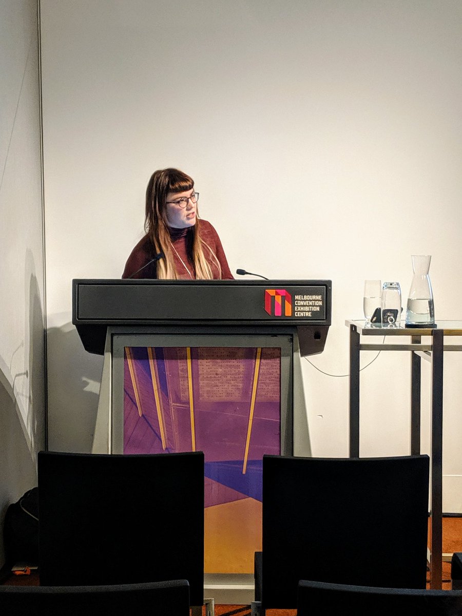 . @ellalowgren is starting out with a talk on player hygiene and how to avoid online harrassment for your devs and players.
