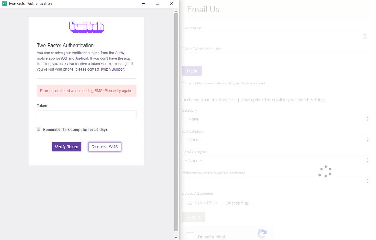 @TwitchSupport I'm unable to log in on my new PC, my phone's settings say 2FA is enabled and yet there is no Twitch in my Authy (so no code), your Request SMS function doesn't send an SMS half the time, or gives this error the rest, and your Contact Support page is broken. HELP.pic.twitter.com/pMXSa6nqto