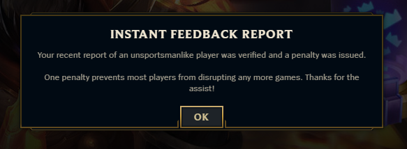 In LoL (and several other games) you do get a notification if a player you reported gets banned. They work in the same was as Instagram, Twitter, etc reports.https://twitter.com/annabrandberg/status/1126382616502870016?s=19 …