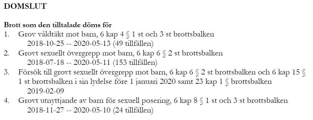 Falu tingsrätt dömde igår en 20-åring till lagens hårdaste straff – 12 års fängelse (efter ungdomsreduktion) - för bl.a. 49 fall av grov våldtäkt mot barn och 153 fall av grovt sexuellt övergrepp mot barn. >pic.twitter.com/OGF6nIZ8Kg