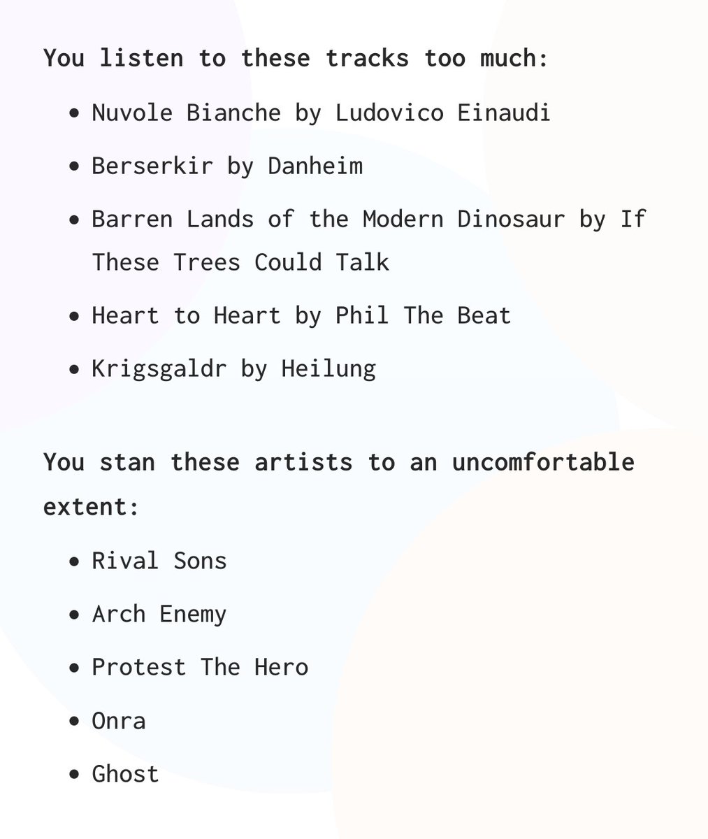 I wanted to get absolutely roasted by this AI for my (unequivocally impeccable) music taste but none of its shaming worked... 😩 @BCInitiate? Shit yes. @RivalSons? Absolute legends. @mgardot? My queen. Another @ProtestTheHero stan? You bet your ass. 🤘😂 https://pudding.cool/2020/12/judge-my-spotify/ … https://twitter.com/puddingviz/status/1341792142088417280 …pic.twitter.com/wdei1sHd4d
