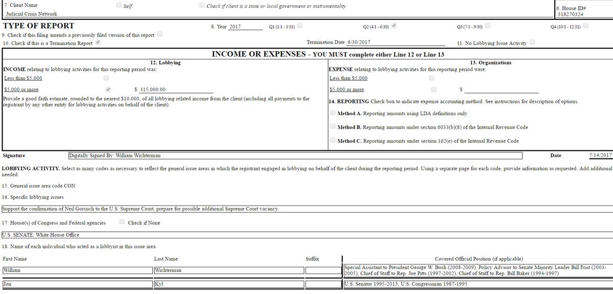 Every lobbyist "dark money" 501(c)(4) Judicial Crisis Network hired for Gorsuch's