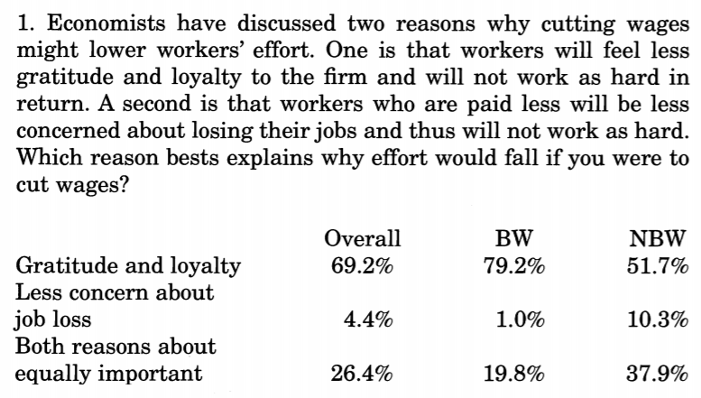 *Sticky wage alert* So I just came across Campbell & Kamlani's fascinating 1997 QJE paper, surveying firms about the reasons why they don't cut wages in recessions. This - and Bewley - are great examples of why we need surveys & interviews! Here are a few excerpts: (1/6)