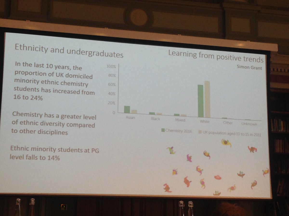Proportion of uk domiciled minority ethnic chemistry students has increased from 16-24% and chemistry has a greater level of ethnic diversity compared to other disciplines. But at PG level falls to 14%. Still much work to be done!