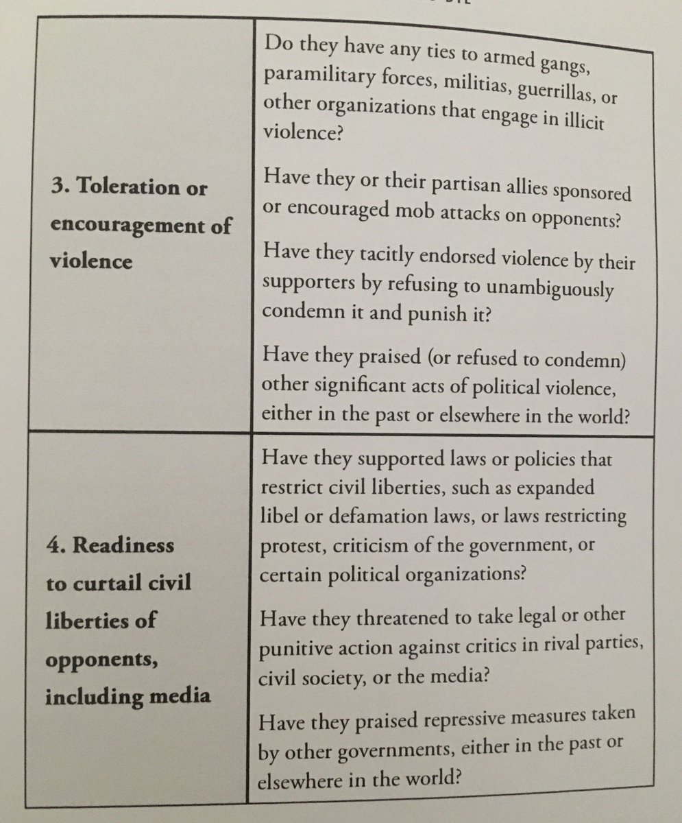 Very useful (and important) checklist. Four indicators of authoritarian behaviour, from Levitsky & Ziblatt’s recent book ‘How Democracies Die’.pic.twitter.com/N8NCr14ig6