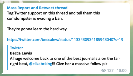 1/ The Proud Boys are targeting journalist Elizabeth King in their Telegram. King was banned from Twitter for calling a male far-right troll a "cunt." The Proud Boys object to this while referring to King as a "cunt" and a "cumdumpster." This is Gamergate all over again.pic.twitter.com/R4MuJaHMqo