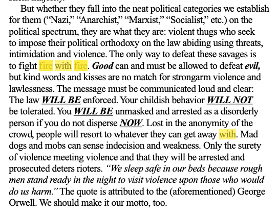 2/ This rhetoric is inflammatory, verging on Biblical. "Good can and must be allowed to defeat evil... [m]ad dogs can sense indecision and weakness. Only the surety of violence meeting violence and that they will be arrested and prosecutors deters rioters."pic.twitter.com/FG1WBvahfn