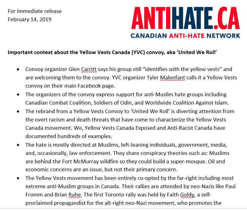 Using a wire service to send this info to newsrooms across Canada cost us $520. We felt it was urgent given that the convoy will arrive in Ottawa on the 19th. If you agree that this was a worthwhile effort, please consider helping us cover that cost at http://antihate.ca/donate .