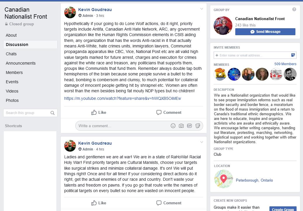 Peterborough neo-Nazi Kevin Goudreau has lied to media and possibly @PtboPolice saying the posts calling for us and others to be murdered were fake. We have a second source. Here's a screenshot from inside Goudreau's Canadian Nationalist Front closed Facebook group.pic.twitter.com/WndaWvh20R