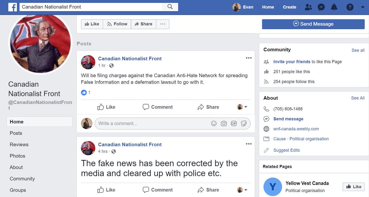 Just to clear up any confusion: Goudreau's Canadian National Front has a Facebook page (public) and a Facebook group managed by the page (closed). Here's the article where he claims it wasn't him:https://www.thepeterboroughexaminer.com/news-story/9229793-peterborough-white-nationalist-kevin-goudreau-denies-posting-call-for-violence-in-wake-of-new-zealand-shooting/ …