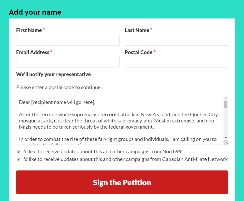 Make one for Islamic terror, as it is a real threat that spands the globe. This petition you have here would have been great in the 1960's, in the southern states of the USA. There is 0 threat from white supremacists in Canada. Stop with the scare tactics, they arent working