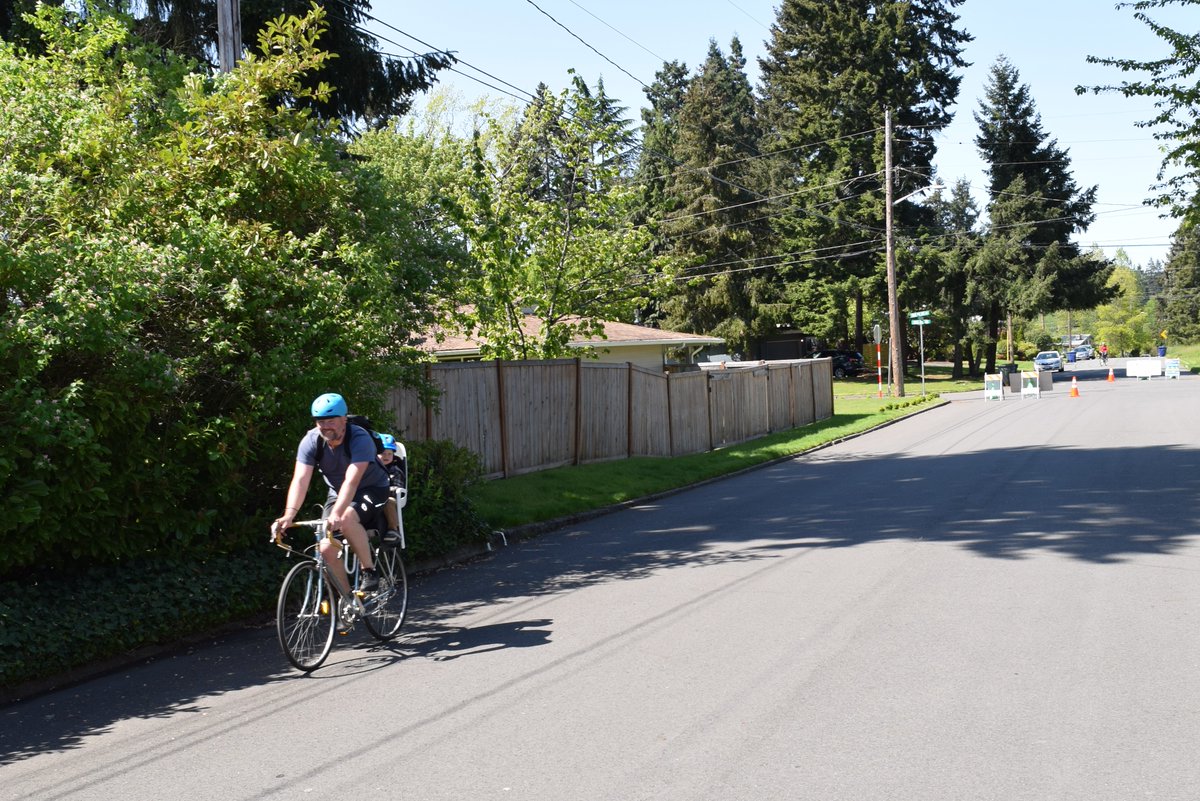 Dog/bike/kid/solo walking. People enjoying the sunshine and the first day of the Bellevue Healthy Streets pilot on SE 4th St. The street is closed to non-local traffic to provide more room to move & social distance (6 feet!) during COVID-19. https://bit.ly/3bcKNUP