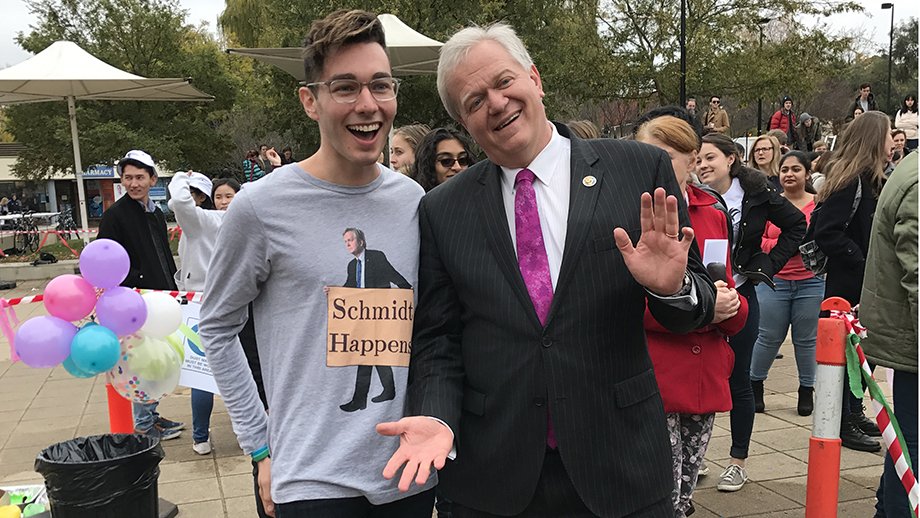 Vice Chancellor Prof. Brian Schmidt admires a student's cheeky T-shirt at the Union Court Farewell event today.