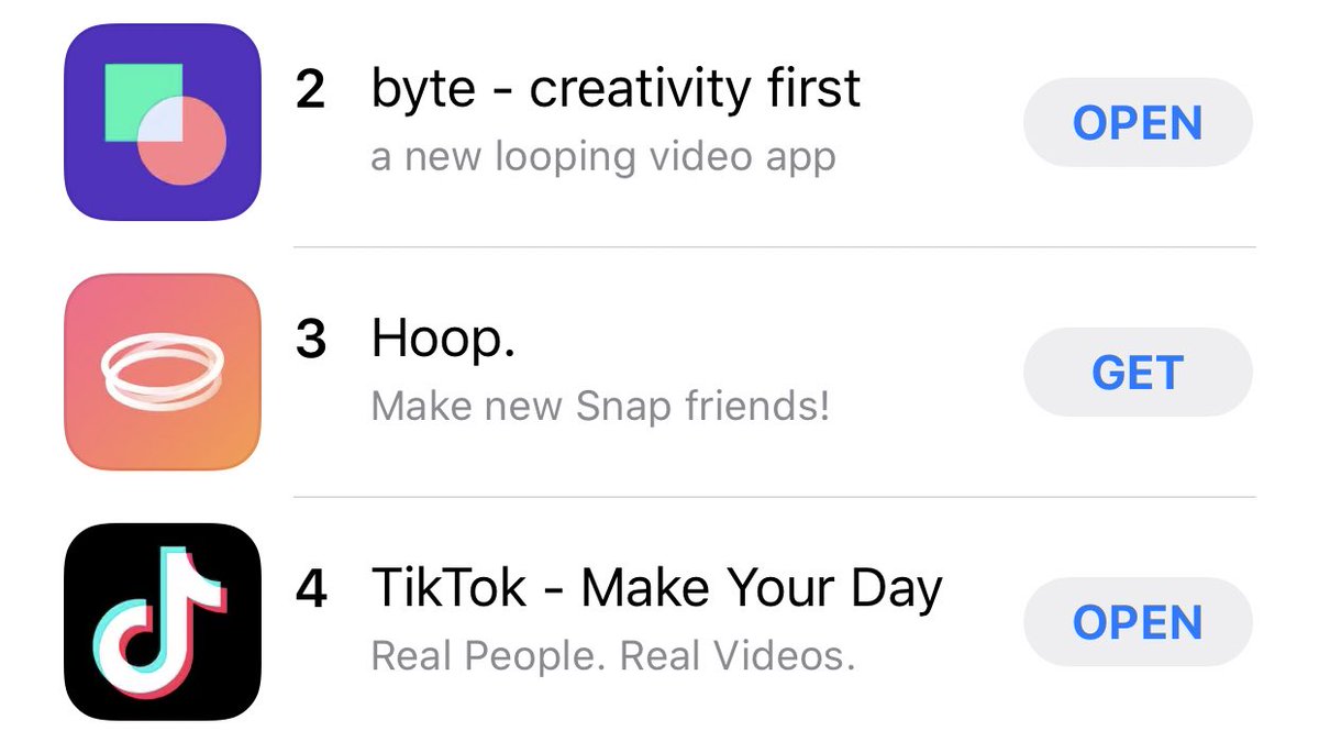 Byte, followed by the SnapKit matchmaker Hoop are currently outranking all of the big tech companies on the App Store.pic.twitter.com/M9Lh8AxrBz