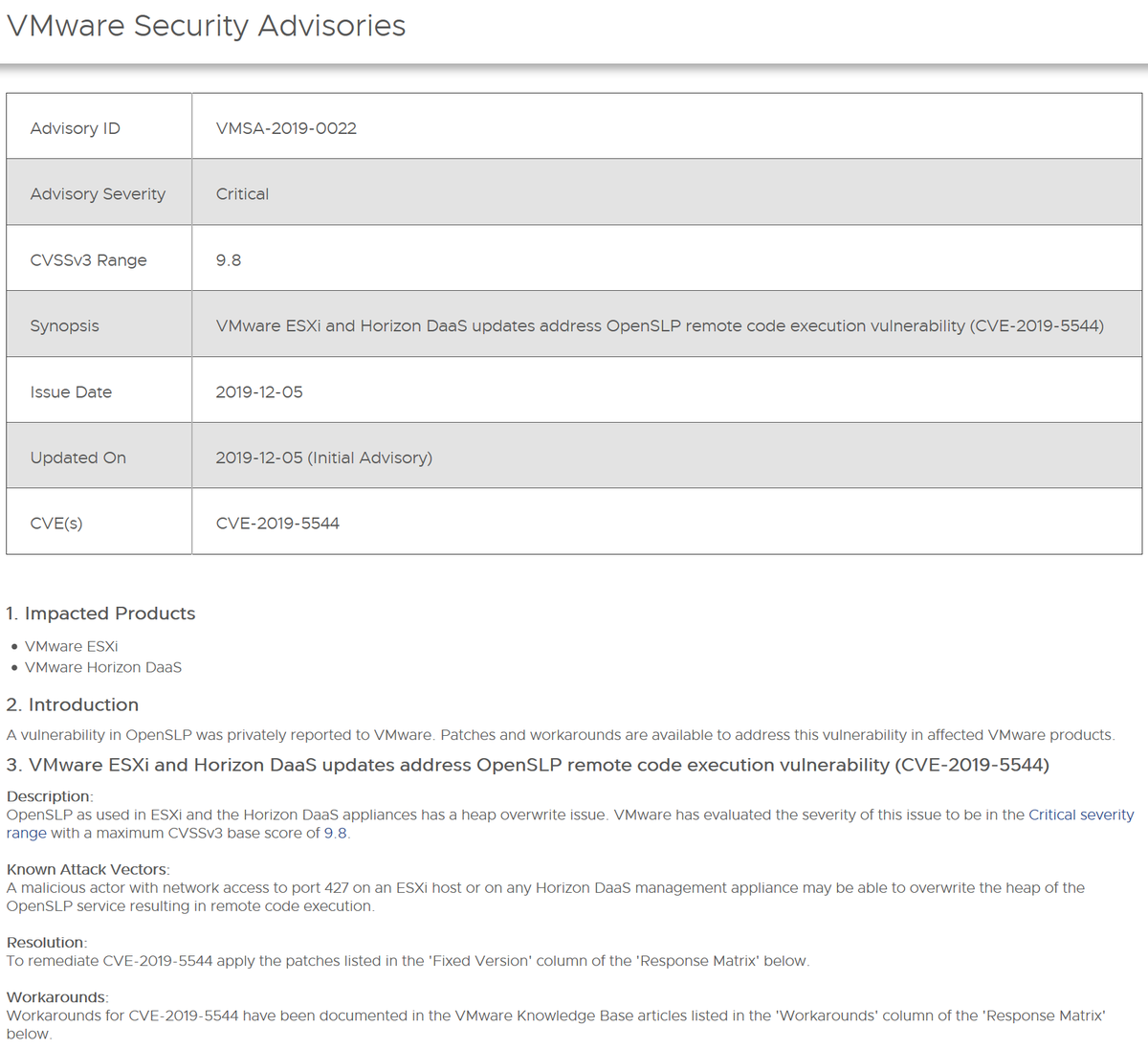 VMware ESXi & Horizon DaaS OpenSLP remote code execution vulnerability (CVE-2019-5544) w/ max CVSSv3 base score of 9.8 If you have virtual DCs & are running ESXi, this is likely a "patch soon" scenario. Workaround (stop SLP service) can break backup systems like Veeam. https://twitter.com/VMwareSRC/status/1202797120698191872 …pic.twitter.com/pvbuPhPf2t