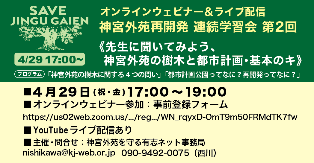いよいよ明日!【神宮外苑再開発連続学習会 オンラインウェビナーのお知らせ】 「先生に聞いてみよう、神宮外苑の樹木と都市計画・基本のキ」4月29日17:00〜19:15