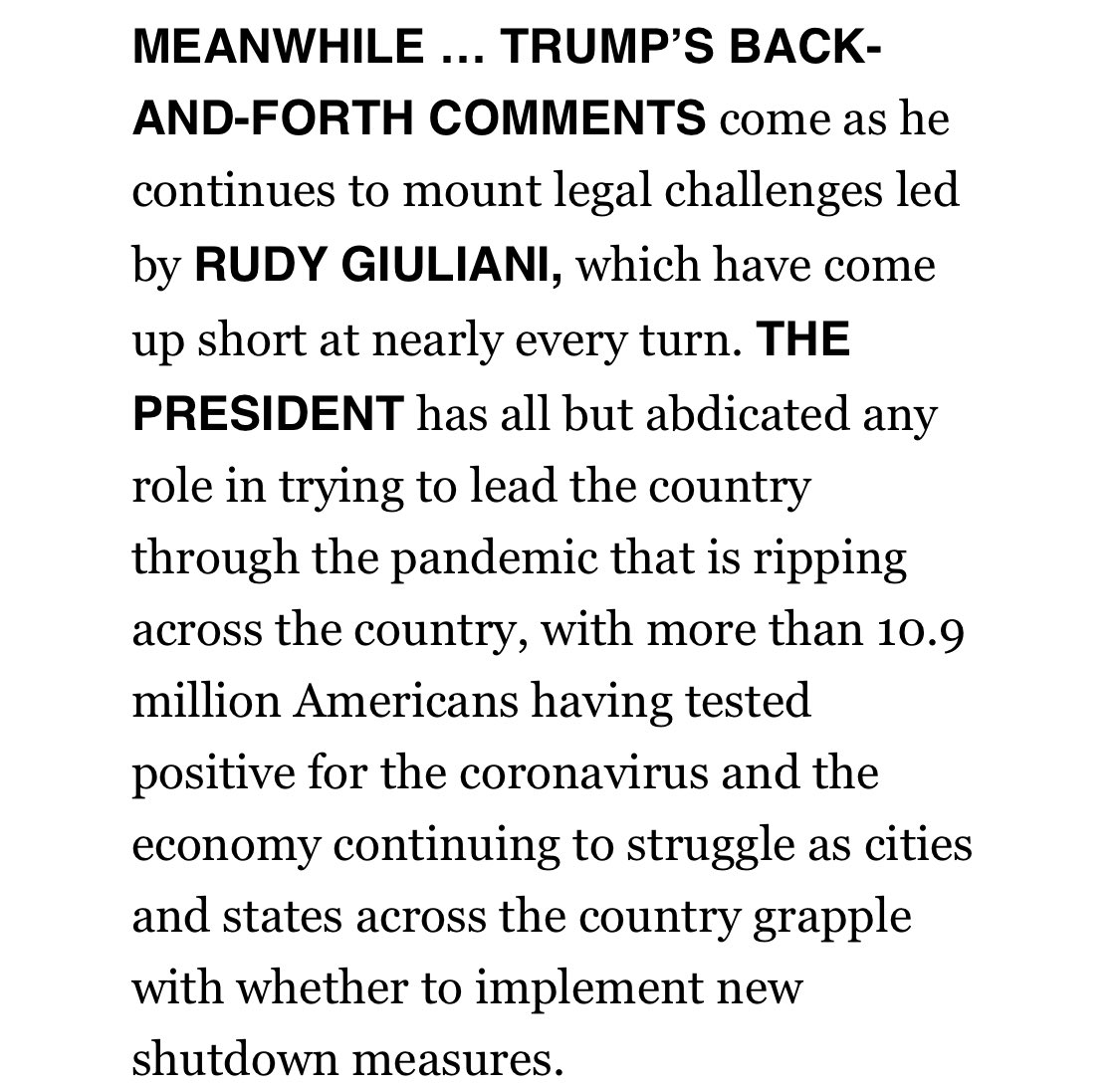 Important context... Trump’s concession/not concession comes as the coronavirus is raging. 10.9M Americans have tested positive and the president is all but missing on trying to get the pandemic under controlpic.twitter.com/11WGiMulNa