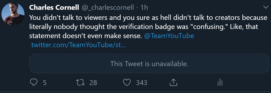 The tweet basically said "we talked to viewers and creators and they told us the verification badge system was confusing." Then @TeamYouTube deleted the tweet... Because they didn't do that and nobody has ever said that.pic.twitter.com/ctsAQABoZc