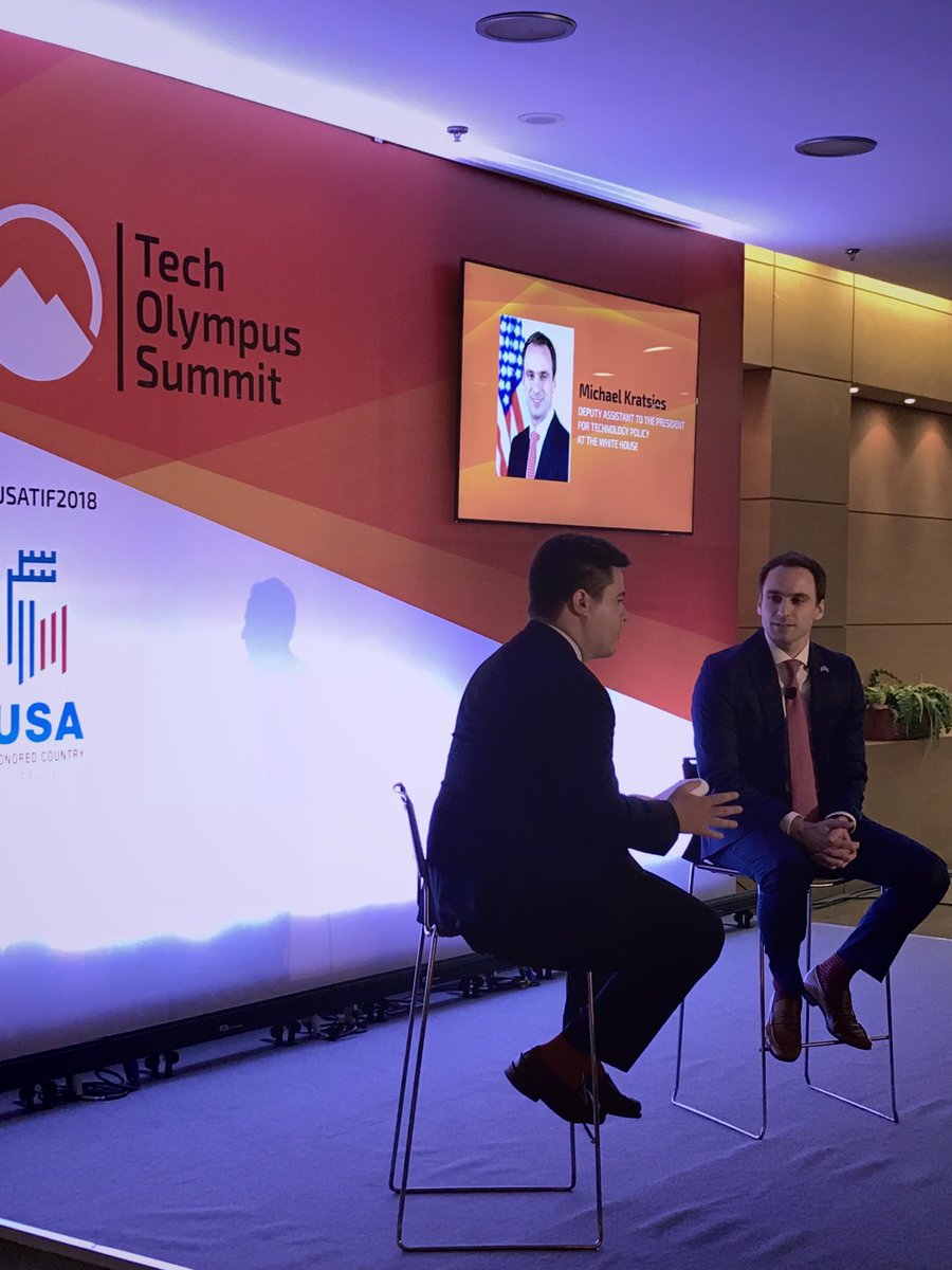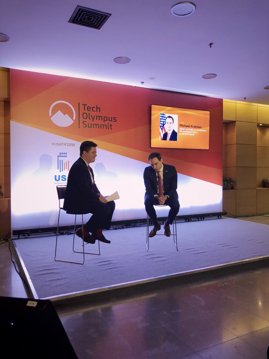 @WHOSTP Deputy Assistant for Technology Policy to@POTUS. We covered a lot of ground—from regulating emerging technologies, to 5G, space, drones, the President’s technology agenda, & Greek–US tech interoperability @#TechOlympusSummit@USATIF_2018.pic.twitter.com/FkBWptJ5ds
