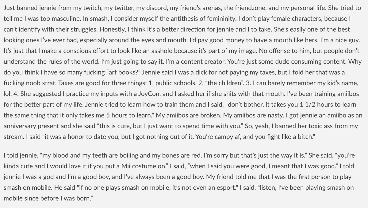 I got jennie an amiibo as an anniversary present and she said “this is cute, but I just want to spend time with you.” So, yeah, I banned her toxic ass from my stream. I said “it was a honor to date you, but I got nothing out of it. You're campy af, and you fight like a bitch.”