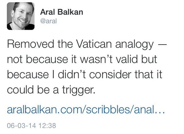 @aral my point between the two is that you found the poster offensive - did you not even consider people may find the analogy offensive? -