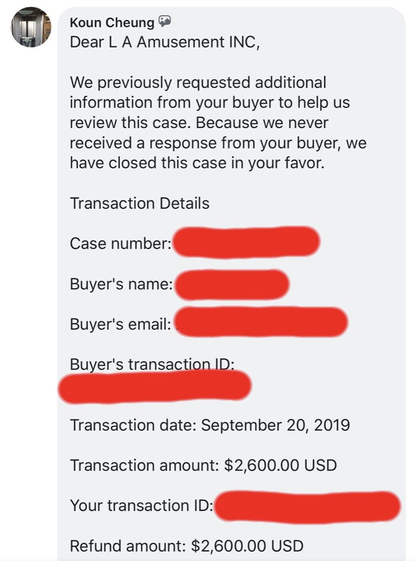 Buyer beware... IF you try to dispute with LA Amusements, KC, Koun Cheung there is a chance he may dox you on Facebook in order to show how big his e-peen is.pic.twitter.com/5ejB22YoA8