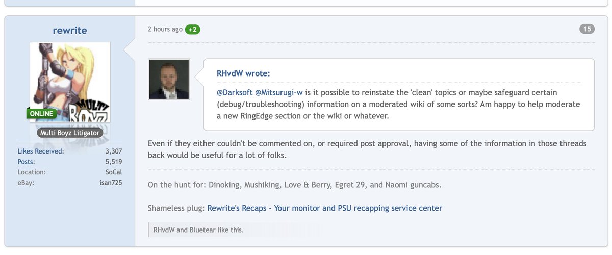 "Even if they either couldn't be commented on, or required post approval, having some of the information in those threads back would be useful for a lot of folks" @64Darksoft and @Mitsurugi_w are gonna need some PayPal "donations" to fix all this, Capisce? https://www.arcade-projects.com/forums/index.php?thread/12974-ringedge-help-section/&postID=211239#post211239 …pic.twitter.com/gfzvcwq6F4