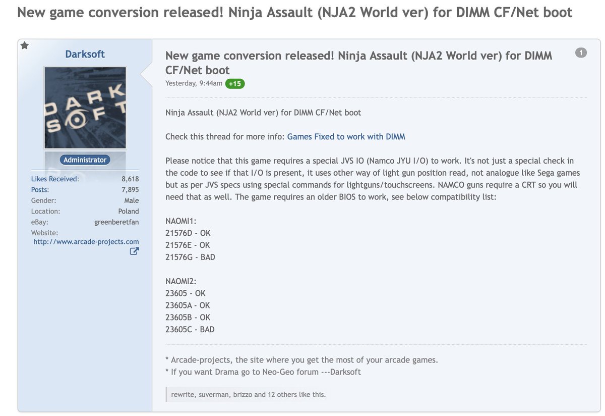 Friendly reminder from @64Darksoft there is a new Netboot conversion of Ninja Assault. If you need it flashed to a CF card contact @Mitsurugi_w & slip him $25 in a DM, and he can make it happen for you. You'll need an SASE (Self Addresses Stamped Envelope) https://www.arcade-projects.com/forums/index.php?thread/13181-new-game-conversion-released-ninja-assault-nja2-world-ver-for-dimm-cf-net-boot/&postID=213178#post213178 …pic.twitter.com/tSQlD811tm