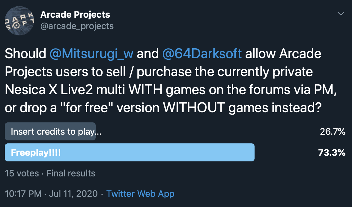 Pretty overwhelming results that you all don't want to pay @mitsurugi_w + @64darksoft for NXL2 games, please show your support further, by DMing him on Arcade Projects forum and reminding him to hurry up with the free multi! Current prices are -$200 off if you mention this tweet!pic.twitter.com/ID4SKZstmJ