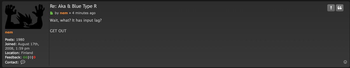 hah no clue how I missed this "There's no way of getting this game running sub 5 frames. I don't know why @shoutime @exaarcadiaceo is so adamant on saying otherwise." https://forum.arcadeotaku.com/posting.php?mode=quote&f=2&p=528784 … lol then Nem wraps it up like a boss "Please continue discussing cardboard quality"pic.twitter.com/x1pSLHIM5V