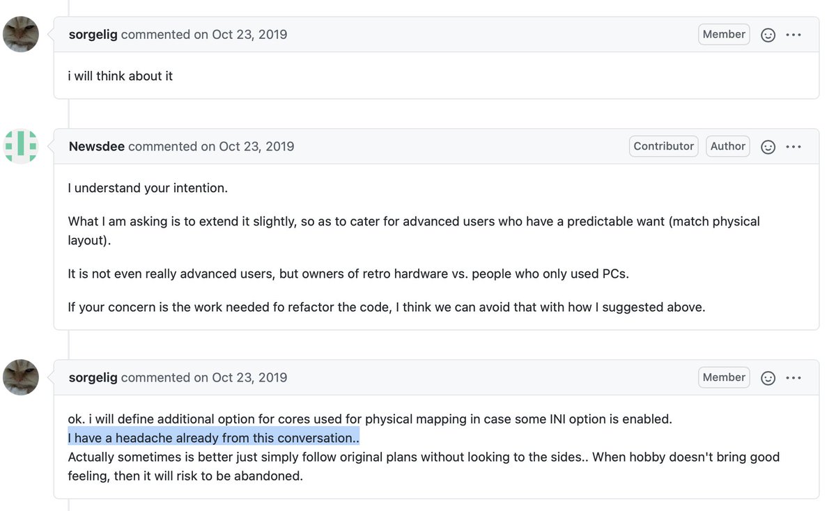 Lol I'm legit surprised this got merged after following the thread. https://github.com/MiSTer-devel/Main_MiSTer/pull/127 … "I have a headache already from this conversation..", legit like pulling teeth, why!? lolpic.twitter.com/PhYBRreKO8