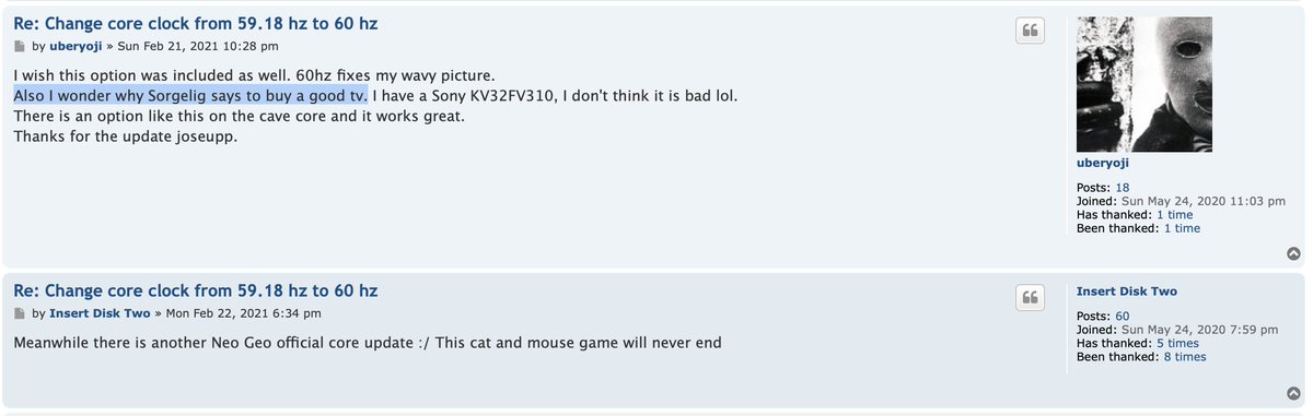 'Well when I asked him if he could implement it I was told "to buy a good TV" :)' ... "This cat and mouse game will never end" https://misterfpga.org/viewtopic.php?p=16459#p16459 …pic.twitter.com/zcUrcSdGxf