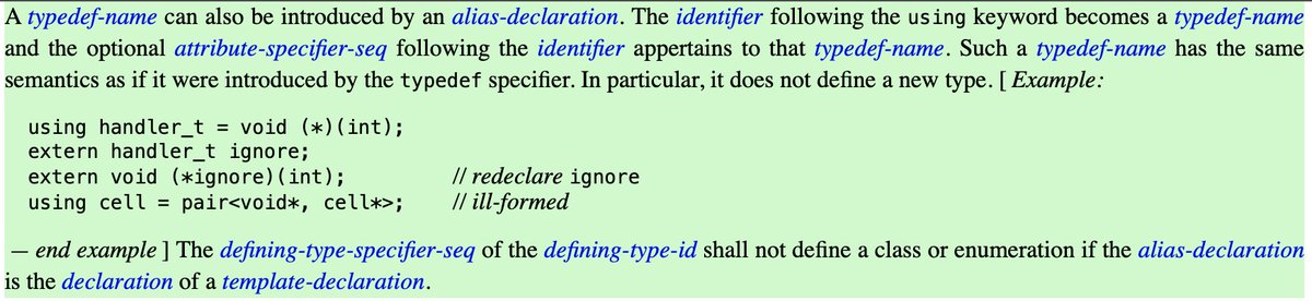 It is basically a typedef brother. "The identifier following the using keyword becomes a typedef-name and the optional attribute-specifier-seq following the identifier appertains to that typedef-name." - https://timsong-cpp.github.io/cppwp/n4659/dcl.typedef#2 …pic.twitter.com/Fmn1KNs1wa