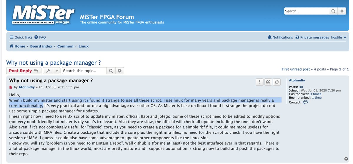 "When i build my mister and start using it i found it strange to use all these script. I use linux for many years and package manager is really a core functionality," pffft shut up noob! https://misterfpga.org/viewtopic.php?f=27&t=2405 … #YouShouldBuyARasPi!pic.twitter.com/9C2YwKoP3R