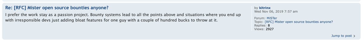 "I prefer the work stay as a passion project. Bounty systems lead to all the points above and situations where you end up with irresponsible devs just adding bloat features for one guy with a couple of hundred bucks to throw at it" #MiSTerFPGA https://www.atari-forum.com/viewtopic.php?f=117&t=37762&p=385970#p385970 … cc /@patreonpic.twitter.com/XHRbHdHN8c