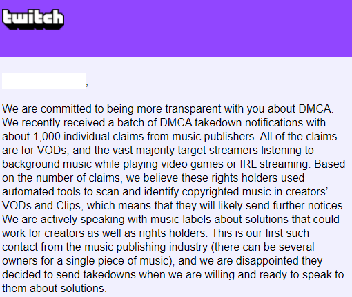Twitch sent out a new email during the night stating they've received 1,000 more DMCA takedown claims from record labels, likely before we see another ban wave. the music industry once again trying their hardest to make the internet a miserable experience pic.twitter.com/DySLlx4YMI