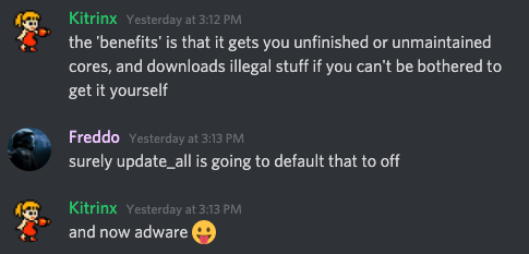 This is my biggest personal conflict with using @theypsilon’s update_all script. It’s great work and the best way to keep Jotego’s work up to date. But half of that script calls amoore’s work. I’ve disabled those scripts but I’d love to see those scripts replaced.