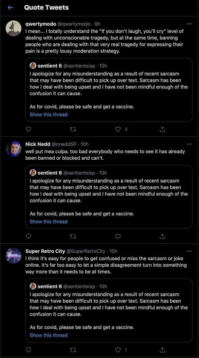 You can't respond (DMs preferred on this subject), but you can Quote Tweet @sentientsixp btw, as some already have. "well put mea culpa. too bad everybody who needs to see it has already been banned or blocked and can't." https://twitter.com/sentientsixp/status/1405371977460699137/retweets/with_comments …pic.twitter.com/23gCDJo39r