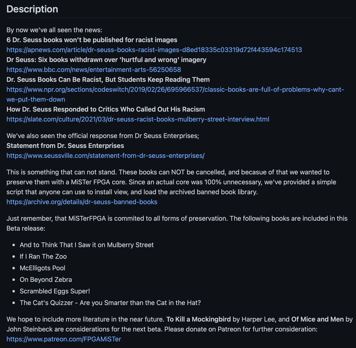 What an amazing day for #MiSTerFPGA! We now have access to a (BETA) MiSTer FPGA Dr. Seuss Reader "core". Looks like it is public for everyone, no DRM involved. These books can NOT be cancelled! #DigitalPreservation #BannedBookArchival. https://github.com/ArcadeHustle/MiSTer_DrSeussReader …pic.twitter.com/qnce6Jm3pa