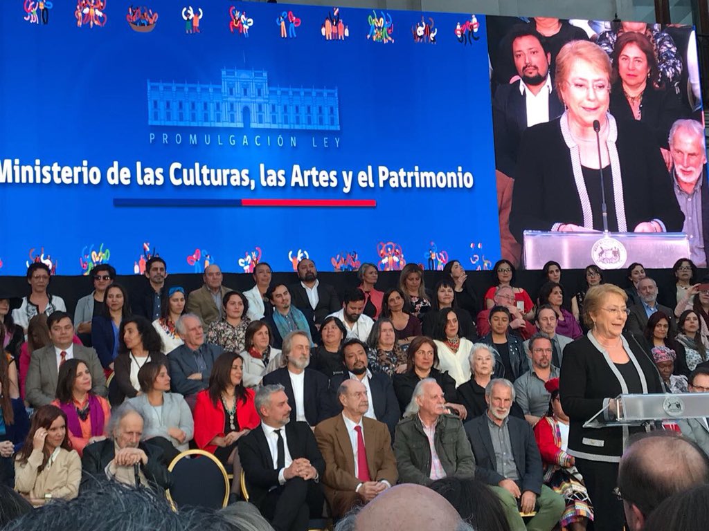 La Pdta. @mbachelet promulga la Ley que crea el #MinisteriodeLasCulturas, las Artes y el Patrimonio.pic.twitter.com/4mnxdcMdnW