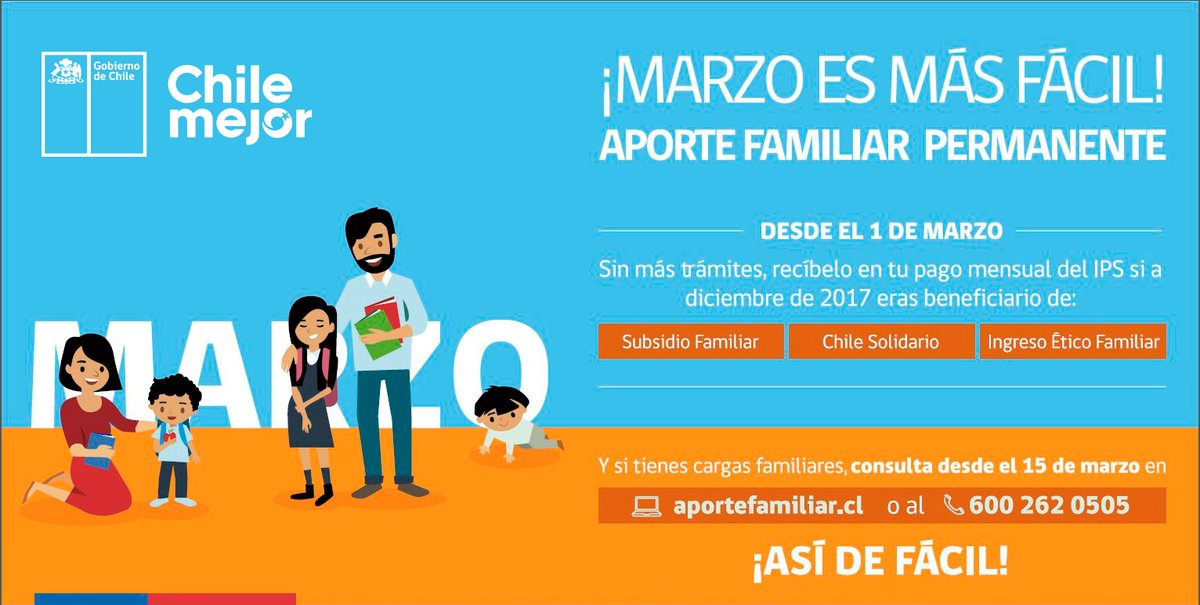 Con el #AporteFamiliar 2018, ¡marzo es más fácil! ¿No sabes si eres beneficiario? Infórmate en http://www.aportefamiliar.cl  . Recuerda que no es necesario postular ni inscribirse para recibirlo. Entérate más sobre este aporte, acá → https://s.gob.cl/2F5m21F  (Vía @GobiernodeChile)pic.twitter.com/jBQKNvjqHj