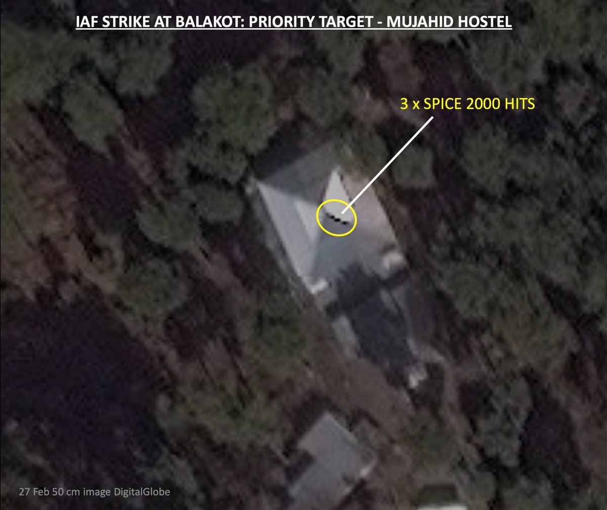 A closer look at the Worldview-2 27 Feb 2019 satellite imagery shows Spice 2000 penetrator bomb entry marks on the roof of the Mujahid hostel at the JeM camp, Balakot? Imagery source - https://www.euspaceimaging.com/pakistan-satellite-imagery-confirms-india-missed-target-in-pakistan-airstrike/ … Updated Spice penetrator bomb analysis - https://medium.com/@sameerjoshi73/hell-for-leather-e8d607efb854 …pic.twitter.com/08LOjVr7Wu