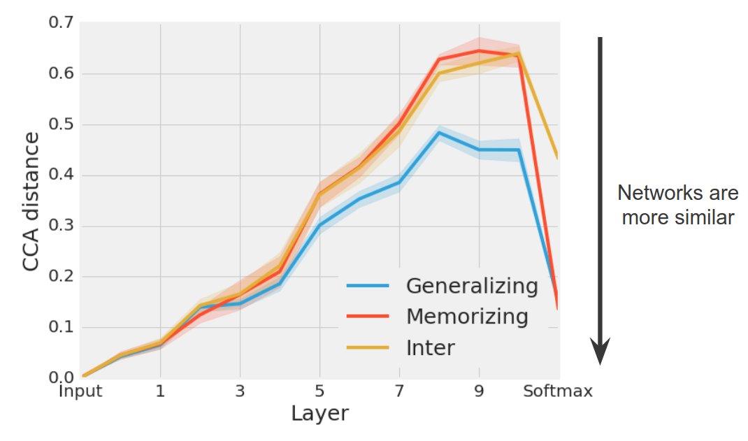 Check out the paper for more detail and controls with other distance metrics, etc. The code for CCA is also open-source (https://github.com/google/svcca/ ), so apply CCA to your networks and see what you find!