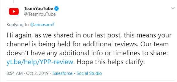 @TeamYouTube Why&how many additional reviews since 6mnth At least give decision in yes/no.Am sure you have highly capable team to reach on any conclusion after a long time of 6 months.Can't you imagine how hard this situation is for someone hanging between Yes/No?pic.twitter.com/9iujdoa4ht