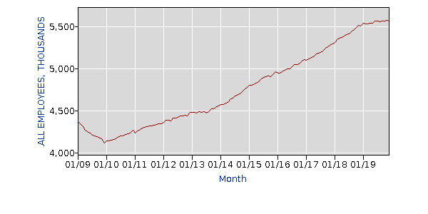 BTW, here is warehousing and transportation. As you can see, employment in that sector mostly stopped growing in the past year. So whatever substitution may be occurring with Amazon/online through growth in warehousing jobs, in the last year it's not helping much.pic.twitter.com/65ufPRg02d