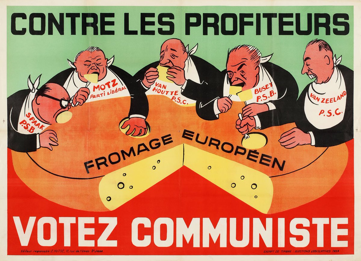"Against the profiteers - vote Communist" — Poster published by the Communist Party of Belgium in 1954 showing politicians of the Liberal, Socialist and Christian Social parties gorging themselves on the great European Cheese.pic.twitter.com/wB2LjUOEVO