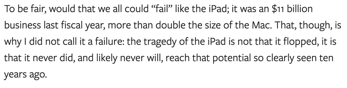 @benthompson calls it a "tragedy" vs a "failure" "the tragedy of the iPad is not that it flopped, it is that it never did, and likely never will, reach that potential so clearly seen ten years ago." https://stratechery.com/2020/the-ipad-at-10-the-ipad-disappointment-ipads-missing-ecosystem/ …pic.twitter.com/3d1CsqacAC