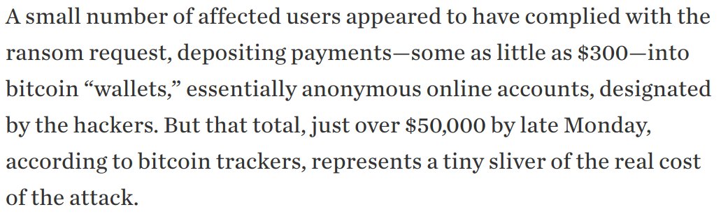 The gigantic ransomware attack that affected 150 countries netted all of $50,000 https://www.wsj.com/articles/cyberattack-spreads-though-at-slower-pace-1494835536?mod=trending_now_2 …pic.twitter.com/udue02Ya7m